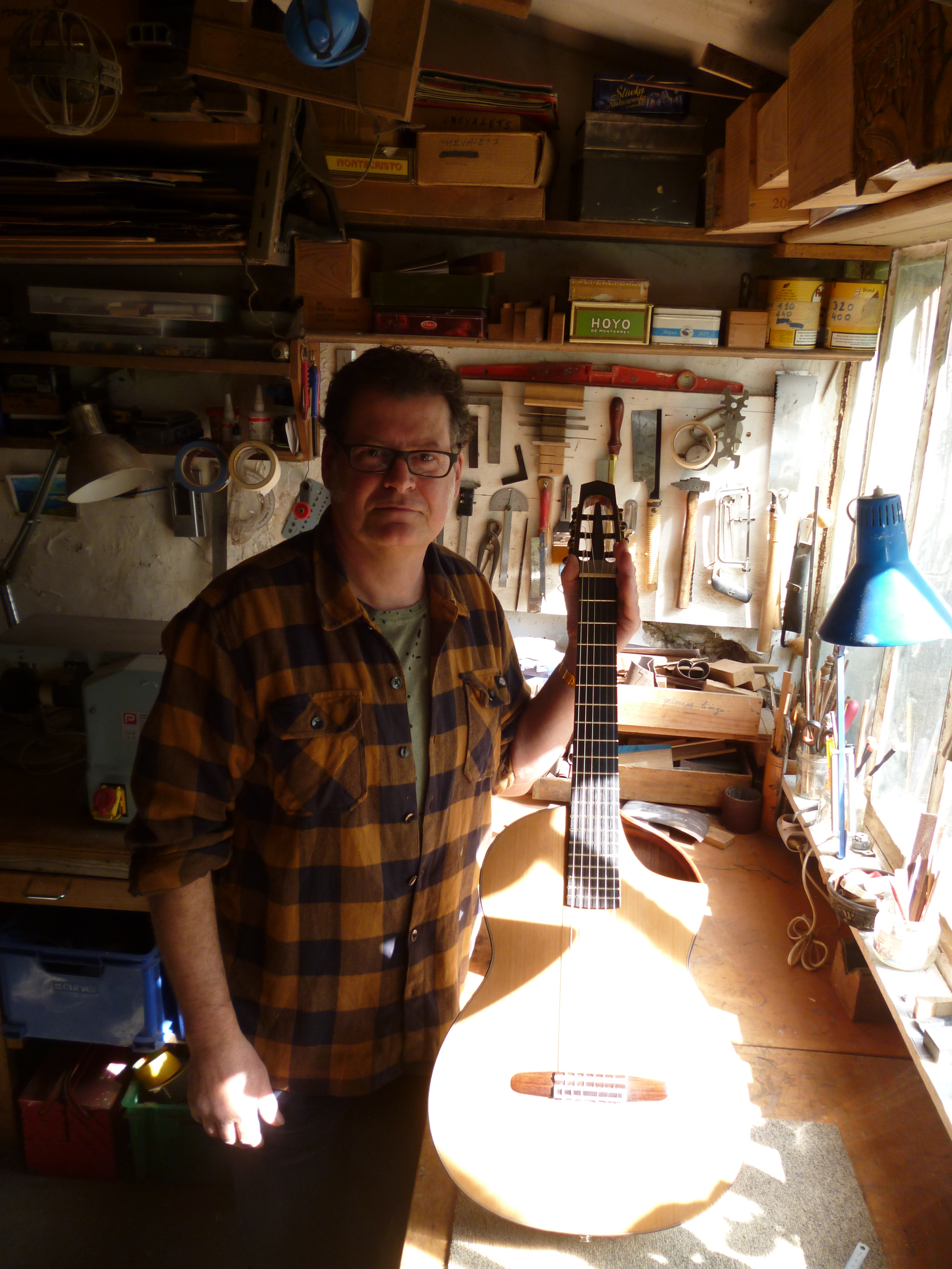 Rencontre avec Gérard Audirac : Je connaissais Gérard de nom seulement. En mars 2013, lors du salon du Beffroi, j’essaye ses guitares. Et là ! ouah ! … Il en rigole encore… j’étais avec mon beau-frère, guitariste, on était tous les deux bouches bées… J’ai été immédiatement séduit… Et puis, le luthier était plutôt accueillant…